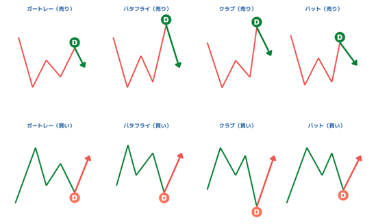 バタフライと同様の「拡張」パターンですが、D点が最も鋭く、大きく伸びるのが特徴です。強力な反転サインとなることがあります。
