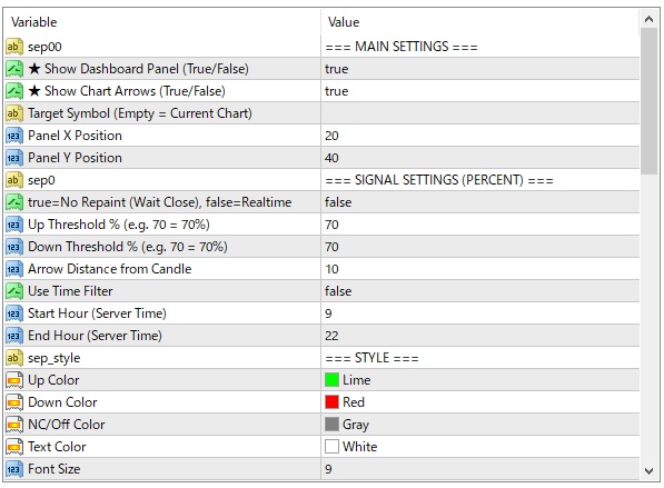 - 上矢印(Lime): 設定した%以上のインジケータが「UP」を示した時に点灯。