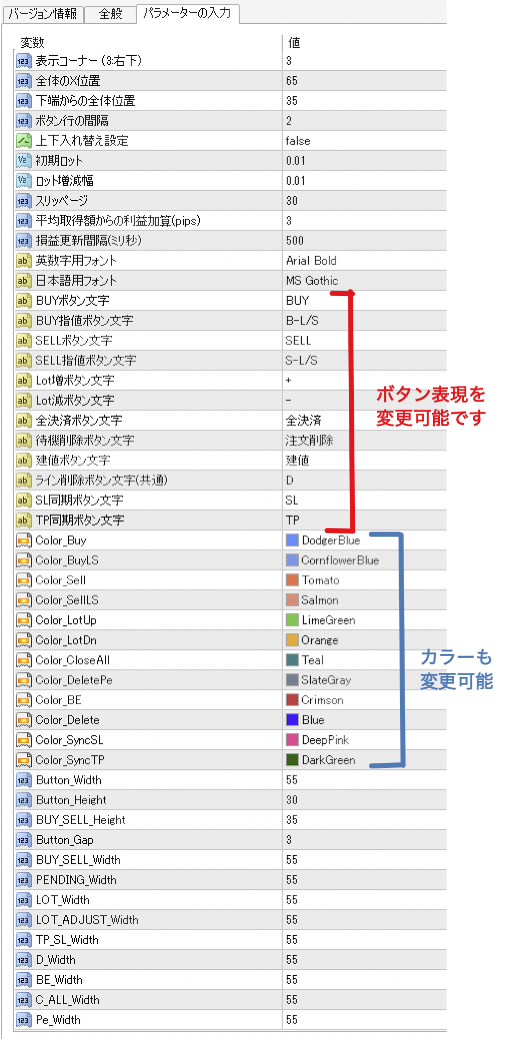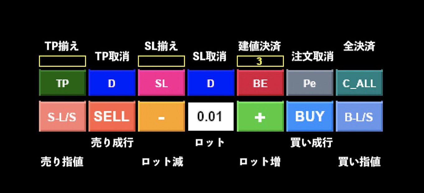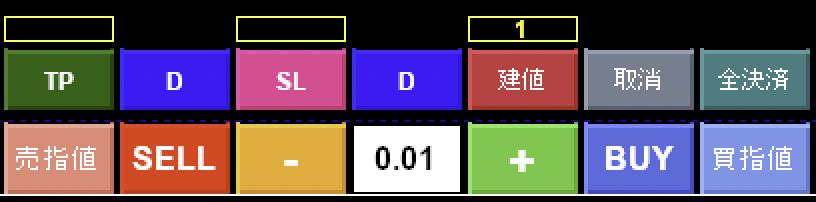指値注文 B-L/Sボタンを押すとラインが出現 ドラッグ移動させてボタンを押すと発注 TP/SLの到達利益、損失額が表示されます。 さらに、利益額、損失額を数値入力すればTP/SLがセットされます。 ナンピン、指値注文、単一銘柄のスキャルパーには最適なツールです。