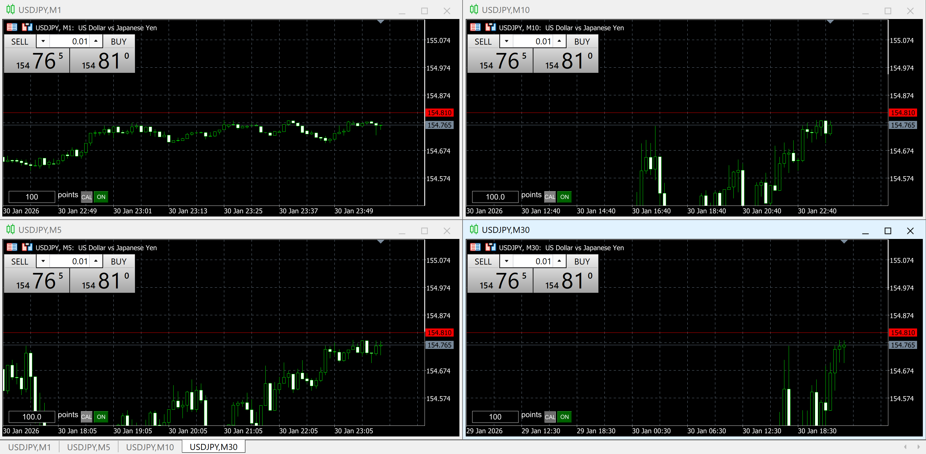 M1・M5・M10・M30のチャートが4つある状態でウィンドウの整列をします