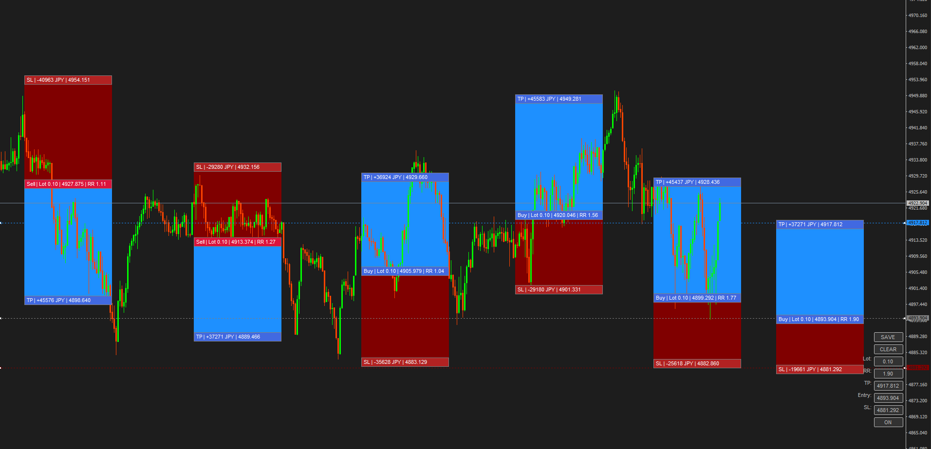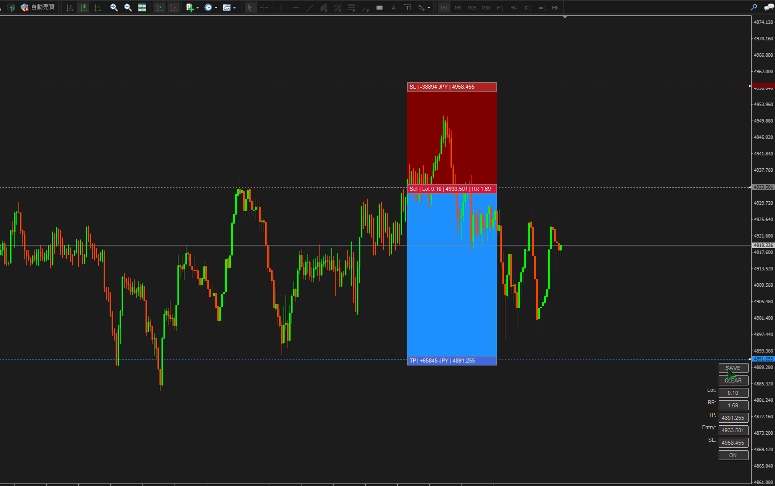 チャートの過去へ移動させ「SAVE」ボタンでオブジェクトをコピーしその場にRR比や損益を描写します。