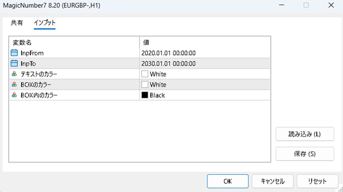 インプットメニューの上2行は対象マジックナンバーが入っていそうな期間です。アバウトに広く設定していればOKです。マジックナンバーで選定します。次の3行は、チャートに表示される入力用BOXのカラーの指定です。このままで問題ありません。
