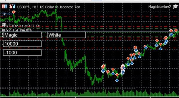 ラインが左から引かれていますが、3457のEAは過去に動作させたことがあり、そこからのラインです。それがいやなら、プロパティで期間を区切ってください。ラインが折れるポイントで約定がなされていることがわかります。(本チャートは3457以外の他のEAの約定も含まれています。)