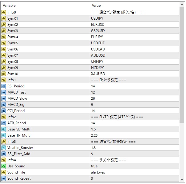 - Pair: 通貨ペアタイプ(Standard / Volatile)。ポンドやゴールド系は赤字で警告表示されます。