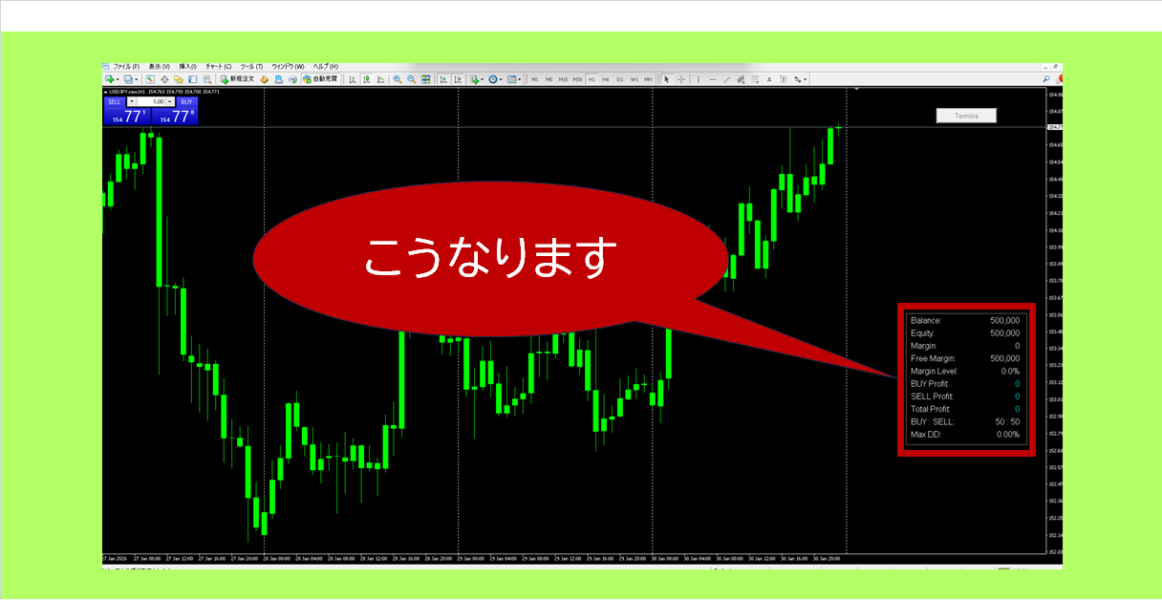 商品概要:ワンクリックで画面スッキリ 大きなターミナルパネルを簡易画面へ切り替える      簡易版表示は[残高][有効証拠金][必要証拠金][余剰証拠金][損益率][BUY損益額][SELL損益額][合計損益額][BUY:SELL比率][損益率]      が一つの小さなパネルに表示されます ワンクリックで通常のターミナルパネルの表示に戻ります 設定項目:基本デフォルトにて使用出来ます パラメーターは全て日本語表記にて説明されています