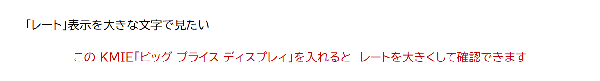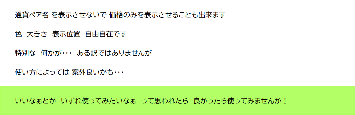 商品概要:レート表示を好きな場所へ大きく表示します 複数チャートを同時監視する際は特に見やすくなります 通貨ペア表示も[あり]/[なし]切り替えできます 設定項目:基本デフォルトにて使用出来ます パラメーターは全て日本語表記にて説明されています