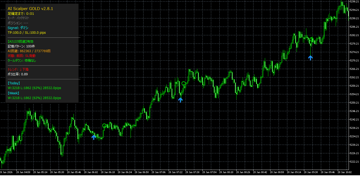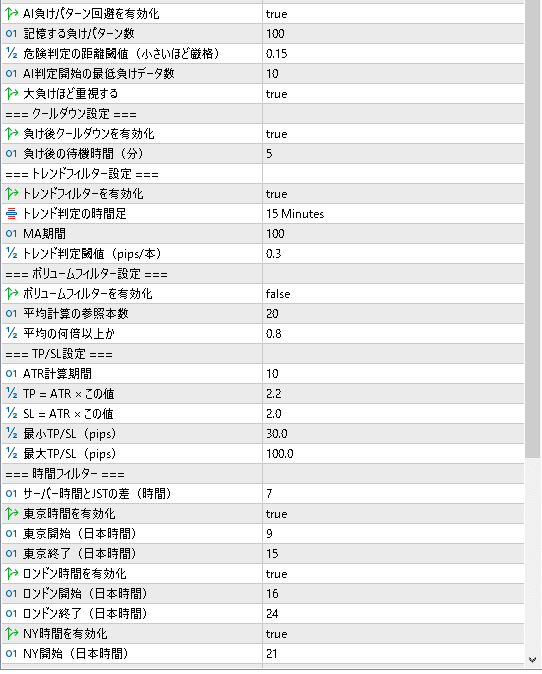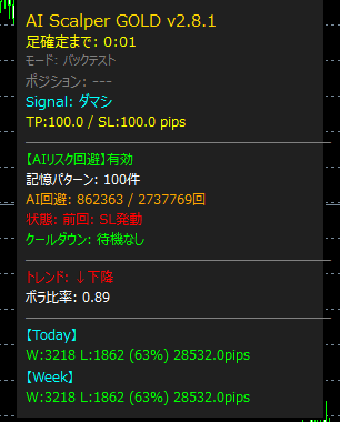 MT5再起動でリセットされます。 これは「今日の相場」に毎回フレッシュに適応するための 意図的な設計です。起動後すぐに学習が始まるので、 セッション中盤にはフィルターが機能し始めます。