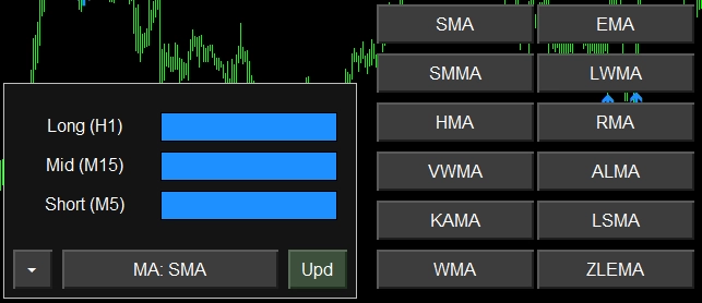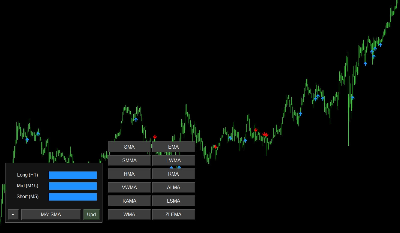 H1・M15・M5の3時間軸MAトレンドを一目で把握。12種類の移動平均線をワンクリック切替、パーフェクトオーダーで売買矢印を自動表示!