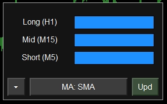 Horizon Trend Matrixは、MT5チャート上に3つの時間軸(H1・M15・M5)のトレンド状態をリアルタイムで表示するマルチタイムフレームダッシュボードインジケーターです。