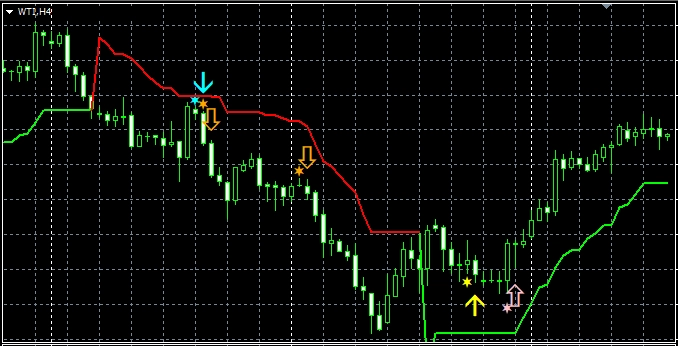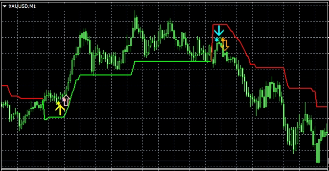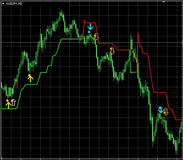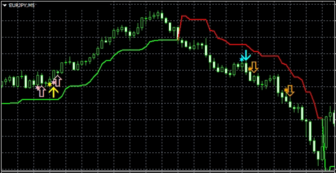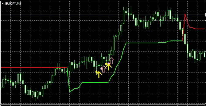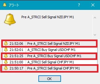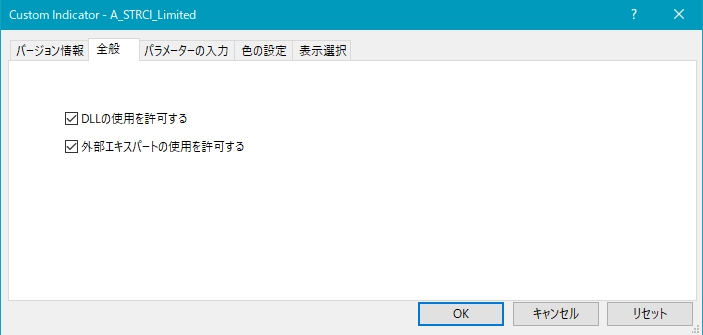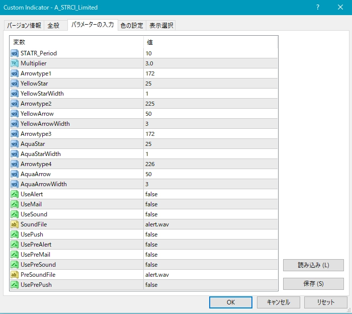 1つ目のスーパートレンドRCIである【A_STRCI】です。 A_STRCI_Limited_XXXXXXXXX.ex4のサインの例  条件を満たしたときに黄色(Yellow)の星印が点灯します。  そして、あるローソク足の終値レベルで黄色(Yellow)の星印の点灯が確定すると、その次のローソク足の寄り付きと同時に黄色(Yellow)の上向き矢印が点灯します。  条件を満たしたときに水色(Aqua)の星印が点灯します。  そして、あるローソク足の終値レベルで水色(Aqua)の星印の点灯が確定すると、その次のローソク足の寄り付きと同時に水色(Aqua)の下向き矢印が点灯します。 下図の通り、"DLLの使用を許可する" にチェックを入れる必要があります。 スーパートレンドに関する設定項目  STATR_Period: ATRの期間  Multiplier: 乗数 ※スーパートレンドが上昇(下降)トレンドの場合、上向き(下向き)矢印のみが表示されるので、スーパートレンドの設定により、表示される矢印が変わってきます。 星印や矢印の表示位置に関する設定項目  星印や矢印の表示位置がローソク足に近すぎて見にくかったり、逆に遠すぎて場合によっては表示位置が画面外になってしまう場合もあります。これらの印を表示する高さを、下記の設定項目の値を調整することにより、修正することができます。値が大きいほど表示位置はローソク足から離れていきます。    (初期設定では黄色の)星印→ YellowStar    (初期設定では黄色の)矢印→ YellowArrow    (初期設定では水色の)星印→ AquaStar    (初期設定では水色の)矢印→ AquaArrow  そして、下記の項目の値を変更することにより、星印や矢印の大きさを変更することができます。     星印(黄色)→ YellowStarWidth     矢印(黄色)→ YellowArrowWidth     星印(水色)→ AquaStarWidth     矢印(水色) → AquaArrowWidth  また、下記の項目の値を変更することにより、星印や矢印の形状を変更することができます。    (初期設定では黄色の)星印 → Arrowtype1    (初期設定では黄色の)矢印 → Arrowtype2    (初期設定では水色の)星印 → Arrowtype3    (初期設定では水色の)矢印 → Arrowtype4  なお、星印や矢印あるいはその代わりとして使用できる記号とそれに対応する番号は下表の通りです。 アラート機能に関する設定項目 [1]矢印サイン点灯時のアラートについて UseAlert:  下図のようなアラートダイアログによりサイン発生を知らせる機能を使用する場合には true、使用しない場合には false を選択する。 UseMail:  メールによりサイン発生を知らせる機能を使用する場合には true、使用しない場合には false を選択する。 UseSound:  アラート音によりサイン発生を知らせる機能を使用する場合には true、使用しない場合には false を選択する。 SoundFile:  アラート音に使うサウンドのファイル名を入力する。 UsePush:  プッシュ通知によりサイン発生を知らせる機能を使用する場合には true、使用しない場合には false を選択する。 [2]星印サイン初回点灯時のアラートについて UsePreAlert:  下図のようなアラートダイアログによりサイン発生を知らせる機能を使用する場合には true、使用しない場合には false を選択する。 UsePreMail:  メールによりサイン発生を知らせる機能を使用する場合には true、使用しない場合には false を選択する。 UsePreSound:  アラート音によりサイン発生を知らせる機能を使用する場合には true、使用しない場合には false を選択する。 PreSoundFile:  アラート音に使うサウンドのファイル名を入力する。 UsePrePush:  プッシュ通知によりサイン発生を知らせる機能を使用する場合には true、使用しない場合には false を選択する。