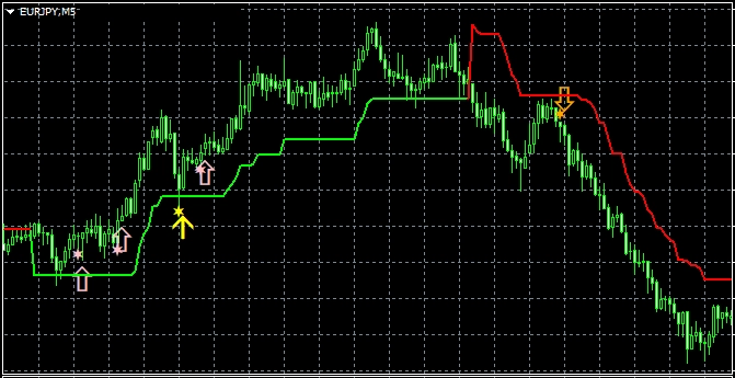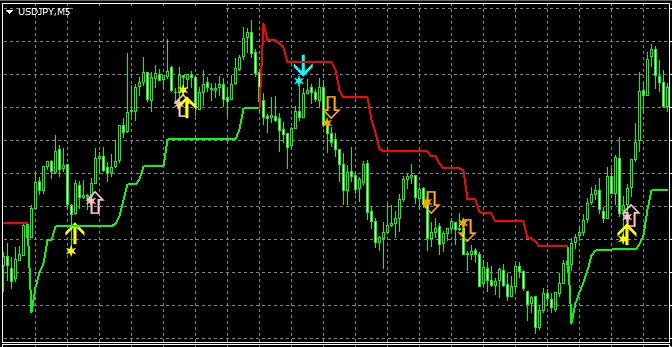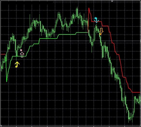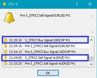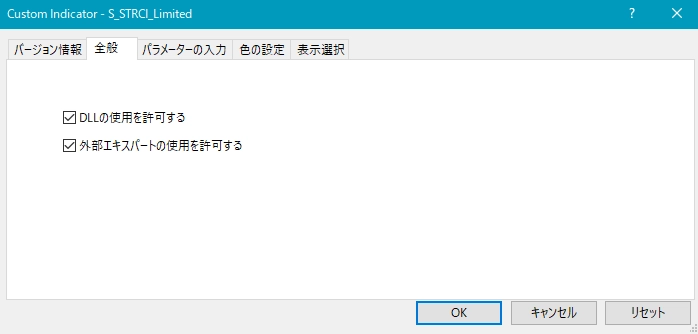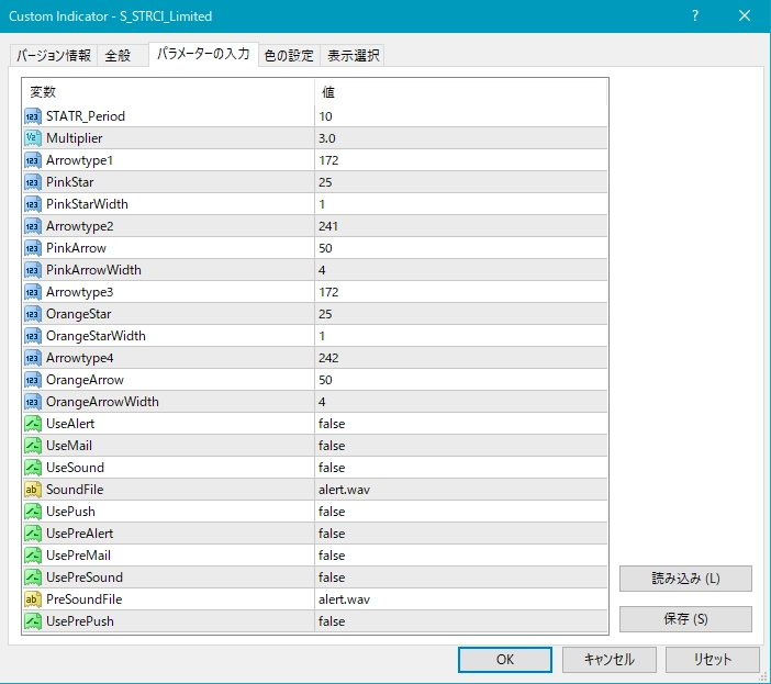2つ目のスーパートレンドRCIである【S_STRCI】です。 S_STRCI_Limited_XXXXXXXXX.ex4のサインの例  条件を満たしたときにピンク色(Pink)の星印が点灯します。  そして、あるローソク足の終値レベルでピンク色(Pink)の星印の点灯が確定すると、その次のローソク足の寄り付きと同時にピンク色(Pink)の上向き矢印が点灯します。  条件を満たしたときにオレンジ色(Orange)の星印が点灯します。  そして、あるローソク足の終値レベルでオレンジ色(Orange)の星印の点灯が確定すると、その次のローソク足の寄り付きと同時にオレンジ色(Orange)の下向き矢印が点灯します。 下図の通り、"DLLの使用を許可する" にチェックを入れる必要があります。 スーパートレンドに関する設定項目  STATR_Period: ATRの期間  Multiplier: 乗数 ※スーパートレンドが上昇(下降)トレンドの場合、上向き(下向き)矢印のみが表示されるので、スーパートレンドの設定により、表示される矢印が変わってきます。 星印や矢印の表示位置に関する設定項目  星印や矢印の表示位置がローソク足に近すぎて見にくかったり、逆に遠すぎて場合によっては表示位置が画面外になってしまう場合もあります。これらの印を表示する高さを、下記の設定項目の値を調整することにより、修正することができます。値が大きいほど表示位置はローソク足から離れていきます。    (初期設定ではピンク色の)星印→ PinkStar    (初期設定ではピンク色の)矢印→ PinkArrow    (初期設定ではオレンジ色の)星印→ OrangeStar    (初期設定ではオレンジ色の)矢印→ OrangeArrow  そして、下記の項目の値を変更することにより、星印や矢印の大きさを変更することができます。     星印(ピンク色)→ PinkStarWidth     矢印(ピンク色)→ PinkArrowWidth     星印(オレンジ色)→ OrangeStarWidth     矢印(オレンジ色) → OrangeArrowWidth  また、下記の項目の値を変更することにより、星印や矢印の形状を変更することができます。    (初期設定ではピンク色の)星印 → Arrowtype1    (初期設定ではピンク色の)矢印 → Arrowtype2    (初期設定ではオレンジ色の)星印 → Arrowtype3    (初期設定ではオレンジ色の)矢印 → Arrowtype4  なお、星印や矢印あるいはその代わりとして使用できる記号とそれに対応する番号は下表の通りです。 アラート機能に関する設定項目 [1]矢印サイン点灯時のアラートについて UseAlert:  下図のようなアラートダイアログによりサイン発生を知らせる機能を使用する場合には true、使用しない場合には false を選択する。 UseMail:  メールによりサイン発生を知らせる機能を使用する場合には true、使用しない場合には false を選択する。 UseSound:  アラート音によりサイン発生を知らせる機能を使用する場合には true、使用しない場合には false を選択する。 SoundFile:  アラート音に使うサウンドのファイル名を入力する。 UsePush:  プッシュ通知によりサイン発生を知らせる機能を使用する場合には true、使用しない場合には false を選択する。 [2]星印サイン初回点灯時のアラートについて UsePreAlert:  下図のようなアラートダイアログによりサイン発生を知らせる機能を使用する場合には true、使用しない場合には false を選択する。 UsePreMail:  メールによりサイン発生を知らせる機能を使用する場合には true、使用しない場合には false を選択する。 UsePreSound:  アラート音によりサイン発生を知らせる機能を使用する場合には true、使用しない場合には false を選択する。 PreSoundFile:  アラート音に使うサウンドのファイル名を入力する。 UsePrePush:  プッシュ通知によりサイン発生を知らせる機能を使用する場合には true、使用しない場合には false を選択する。