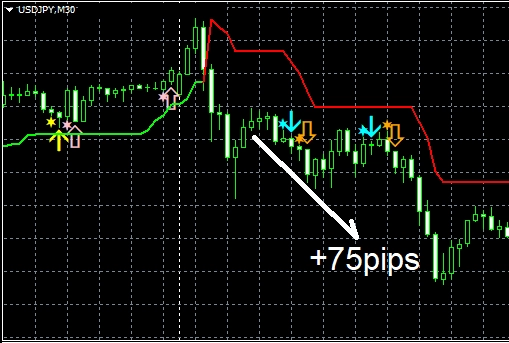 RCIスーパートレンド(Supertrend)は非常に人気の高いインジケーターです。 ※本手法の基本コンセプトは、RCIスーパートレンド(Supertrend)の長所を生かすとともに、両者の短所を相互補完するというものです。 ※付属PDFでは、主にRCI3本ラインスーパートレンドおよびオリジナルインジケーターであるスーパートレンドRCI(A-STRCIとS-STRCI)を絡めた手法について詳しく解説しています。 トレード手順 (1)付属PDFで解説している手法に従い、上位足を観察し、下位足でオリジナルインジケーターであるスーパートレンドRCI(【A-STRCI】あるいは【S-STRCI】)の矢印サインを待つ形まで持ち込む。 (2)下位足でオリジナルインジケーター(【A-STRCI】あるいは【S-STRCI】)の矢印サインに従いエントリーする。 (3)付属PDFで解説している手法に従い、損切りラインを設定する。 (4)付属PDFで解説している手法に従い、利食いポイントに達するのを待つ。 ドル円 4時間足 ドル円 1時間足 ドル円 30分足 ドル円 15分足 ドル円 5分足 ドル円 1分足 ※どの通貨ペアでもトレード可能です。 ※どのタイムフレームでもトレード可能です。 ※ゴールド(XAUUSD)のトレードにも適しています。 ゴールド/米ドル(XAUUSD) 5分足 ゴールド/米ドル(XAUUSD) 1分足  本商品に含まれているインジケーターはMT4用です。 リペイントなしのインジケーターです。 アラート機能(メール,サウンド,ダイアログ)及びプッシュ通知機能が付いています。 星印と矢印のコードの設定項目があるので、星印と矢印の色、大きさや表示位置のみならず、形状についても変更することが可能です。 2つの矢印インジケーターの同時表示例 (A_STRCI_Limited_XXXXXXXXX.ex4とS_STRCI_Limited_XXXXXXXXX.ex4)