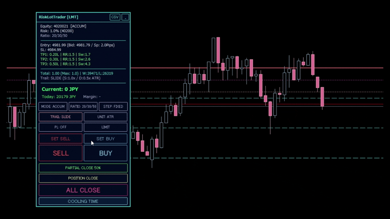 戦略:SINGLE(単発)/ ACCUM(ナンピン積立)/ PYRAMID(順行積立) RR比率:3種類ボラや通貨ペアに応じて戦略の選択 ロット分割:100%・50/50 %・ 30/70 %・ 33/33/34 %・ 20/30/50% 注文方法:LIMIT (指値)/ MARKET(成行)/ SLIMIT( SETボタンを押すだけでツールがトレードの優位性を瞬時に計算