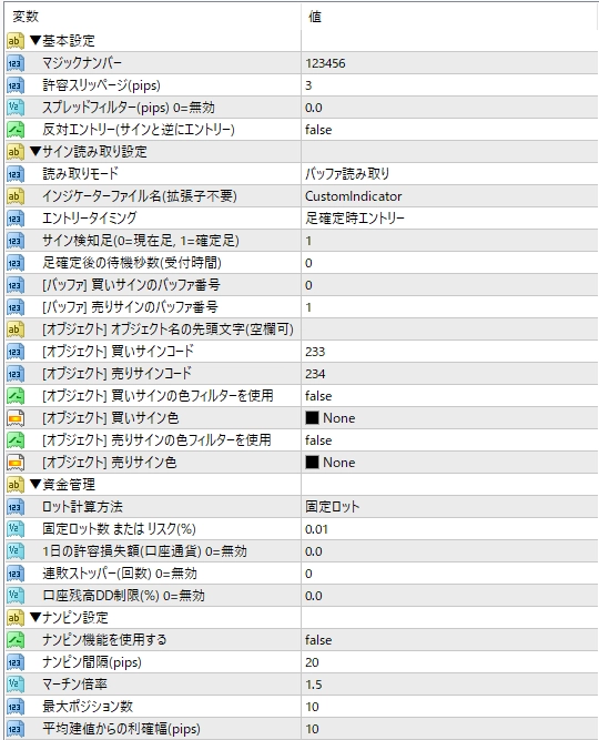 本EAの使用開始、設定値の決定、運用の停止等の判断は、すべてお客様ご自身の責任において行ってください。 動作確認のお願い ご購入前に、必ず無料配布しております「動作確認用ツール(Sign_Scan_EA_test)」にて、お手持ちのインジケーターが正常に読み取れるかをご確認ください。