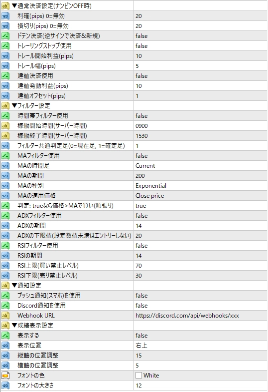 これらのフィルターはすべてON/OFFを個別に切り替えられるので、お使いのインジケーターや通貨ペアの特性に合わせて自由に組み合わせられます。