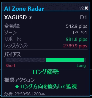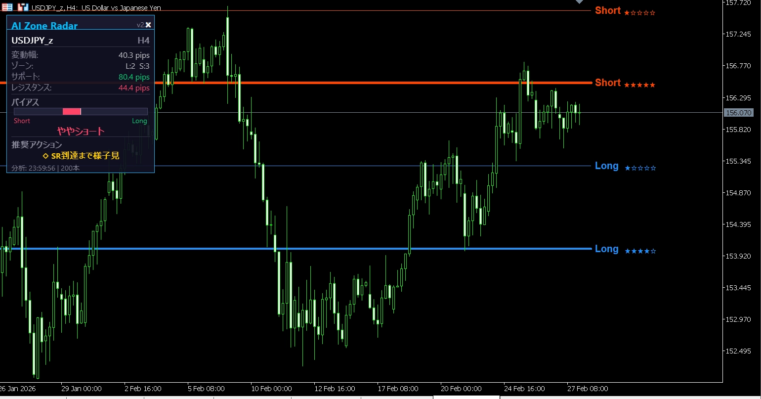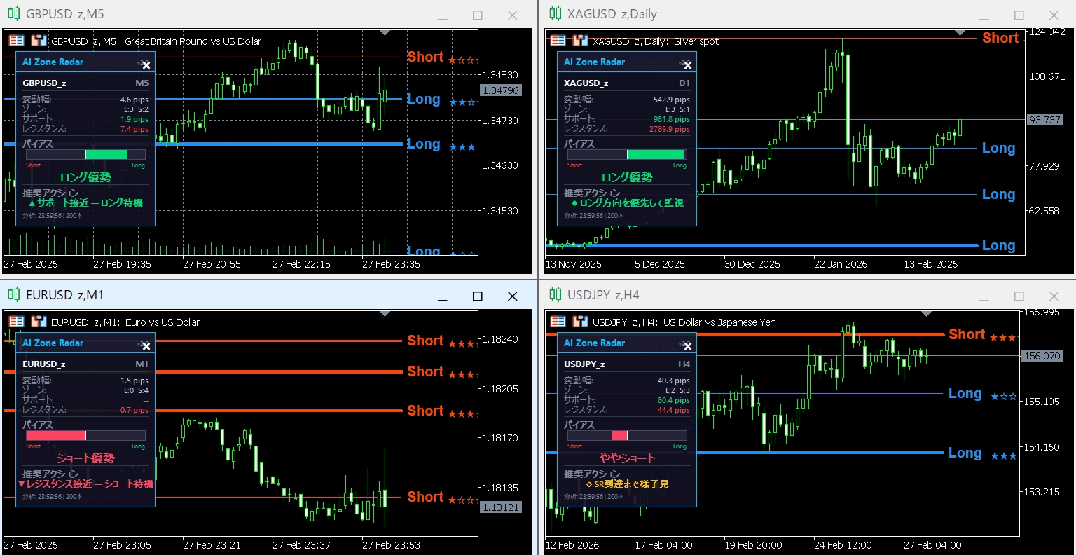 ▶ 現在の変動幅(ATR pips表示) ▶ 検出ゾーン数(Long / Short) ▶ 最寄りサポート/レジスタンスまでの距離(pips) ▶ バイアスゲージバー — ロング/ショートの優劣を視覚的に表示 ▶ 推奨アクション — 「サポート接近 - ロング待機」「SR到達まで様子見」等、6パターンの状況判断
