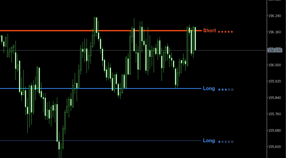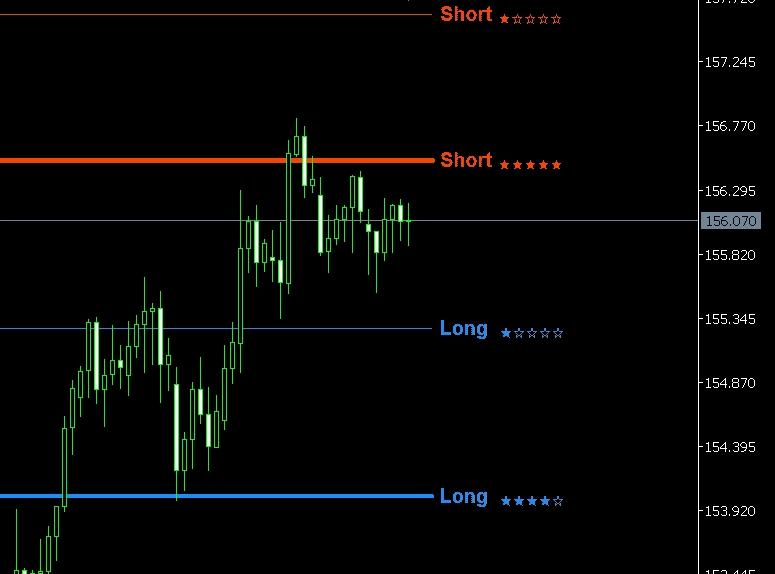 ▶ ライン太さ = ゾーンの強さ(★1=極細 〜 ★5=極太) ▶ ★レーティング表示 — 一目でゾーン強度がわかる ▶ 赤ライン = Short方向(レジスタンス)、青ライン = Long方向(サポート)