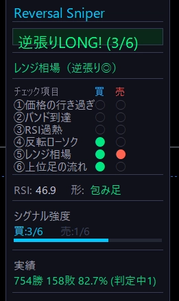 こんな経験、ありませんか? 「この辺が底っぽいから買いで入ろう」→ そのまま下落して損切り。 「RSIが売られすぎだから反発するはず」→ さらに下がって含み損拡大。 「ボリバンにタッチしたから逆張りだ」→ バンドウォークで踏まれる。 逆張りで負ける原因は、根拠が1つしかないことです。 RSIだけ。ボリンジャーバンドだけ。ローソク足の形だけ。 1つの根拠だけで入るから、勝率が安定しないのです。 ━━━━━━━━━━━━━━━━━━━━ Reversal Sniperが解決します ━━━━━━━━━━━━━━━━━━━━ Reversal Sniperは、6つの異なるテクニカル分析を同時にチェックし、 複数の根拠が揃った時だけシグナルを表示する逆張り特化型インジケーターです。 「なんとなく反発しそう」ではなく、 「6つの条件のうちX個が同時に成立したから、ここは反発の確率が高い」 と数字で判断できるようになります。 ━━━━━━━━━━━━━━━━━━━━ ◆ 6つのチェック項目 ━━━━━━━━━━━━━━━━━━━━ Reversal Sniperは、1回のシグナルに対して以下の6つを同時チェックします。 ① 価格の行き過ぎ  → MAからの乖離率が統計的に異常な水準か(1.5σ超) ② バンド到達  → ボリンジャーバンド(2σ)の端にタッチしたか ③ RSI過熱  → RSIが30以下(売られすぎ)or 70以上(買われすぎ)か ④ 反転ローソク  → ピンバー・包み足・はらみ足が出現したか ⑤ レンジ相場  → ADXが低く、逆張りが効きやすい環境か ⑥ 上位足の流れ  → 上位時間足の方向と一致しているか(押し目/戻り) この6つのうち、3つ以上が同時に成立した場合のみシグナルを表示します。 (閾値はパラメーターで自由に変更可能) ━━━━━━━━━━━━━━━━━━━━ ◆ なぜ「合流」が重要なのか ━━━━━━━━━━━━━━━━━━━━ テクニカル分析は、1つだけでは信頼度が低いです。 RSIが30以下でも、強い下降トレンド中ならそのまま下がります。 ボリンジャーバンドにタッチしても、バンドウォークで戻りません。 ピンバーが出ても、環境がトレンドなら反転しません。 しかし、複数の根拠が同じ方向を指した時は話が変わります。  ・RSIが売られすぎ ← 指標が反転を示唆  ・バンドの下限に到達 ← 統計的な極値  ・ピンバーが出現 ← 実際に買い圧力が発生  ・ADXが低い ← レンジ相場で逆張りが効く環境 これが4つ同時に揃う場面は、1つだけの時と比べて 明らかに反発確率が高くなります。 Reversal Sniperは、この「合流」を自動で検出して可視化するツールです。 ━━━━━━━━━━━━━━━━━━━━ ◆ リアルタイムパネル ━━━━━━━━━━━━━━━━━━━━