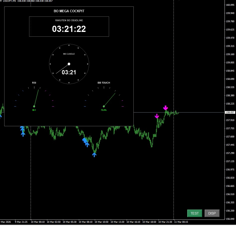 3. RSI / BB TOUCH メーター(左右): 相場の過熱感(買われすぎ・売られすぎ)をアナログメーターの針で視覚的に示します。