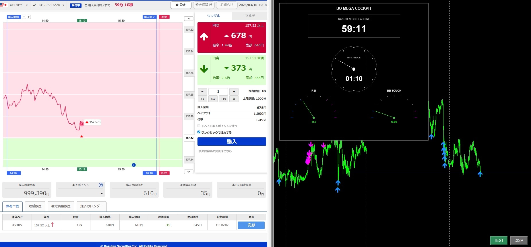 • STEP 1:警告フラッシュ(締め切り5分前) 楽天の受付終了5分前(〇〇:13)になると、上部のデジタル時計が激しく点滅し、警告アラートが鳴ります。ここから確定する5分足が、今回の回号でエントリーできる「最後の勝負足」です。取引画面を準備してください。
