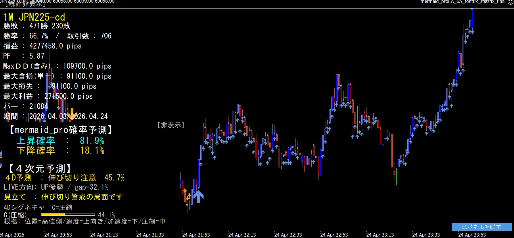 『mermaid』は、システムが自分でチャートを学習し、進化するシステムです。過去とリアルのchartから上昇確率と下降確率を算定し、一定の基準以上になったときに大きな矢印サインを出します。その後もトレンドが継続して基準値を超えている間は、小さな矢印が表示されます。損益集計データが示す通り、サイン通りに交互に買ったり売ったりするだけで、大きな利益が期待できます。また、画面左下には、このシステムのベースである上昇確率と下降確率が常に表示されます。なお、2つの情報パネルは、パネル上でクリックすると、非表示になったり再表示されたりするので、邪魔にはなりません。
