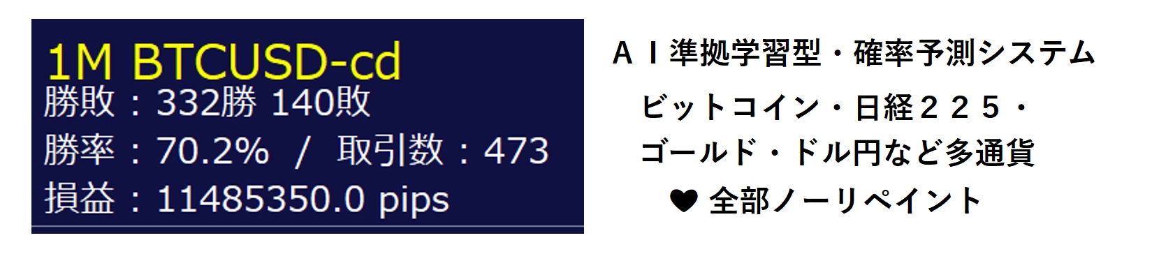 ゴールド、ビットコイン、日経225及びドル円などの普通の通貨ペアに対応しています。一般通貨ペアでは、ドル円を基本に調整していますので、他の通貨ペアで利用する場合は、ぴったりマッチして、高い勝率が出ているchartを選ぶのが上手なやり方です。