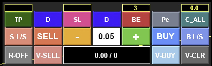 仮想トレードのボタンは、最下段(3列目)に配置 ・R-OFFボタンを押すと赤に変わり、リアルトレードできます。ご発注防止で作りました。 ・V-SELLボタンは、仮想SELLエントリーボタン ・0.00/0はロット数と損益を表示します(ロット数は2段目のボタンで調整)