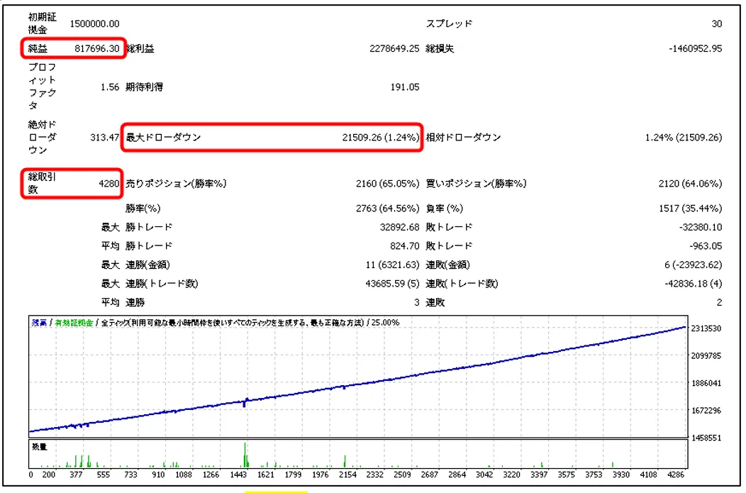 純益 817,696円 最大ドローダウン 21,509円(1.24%) 総取引数 4,280