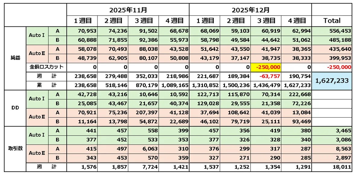 ・全損ロスカット=証拠金100万円を差し引いても2カ月間で損益2,071,806円
