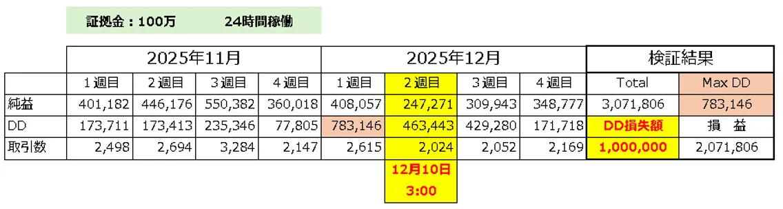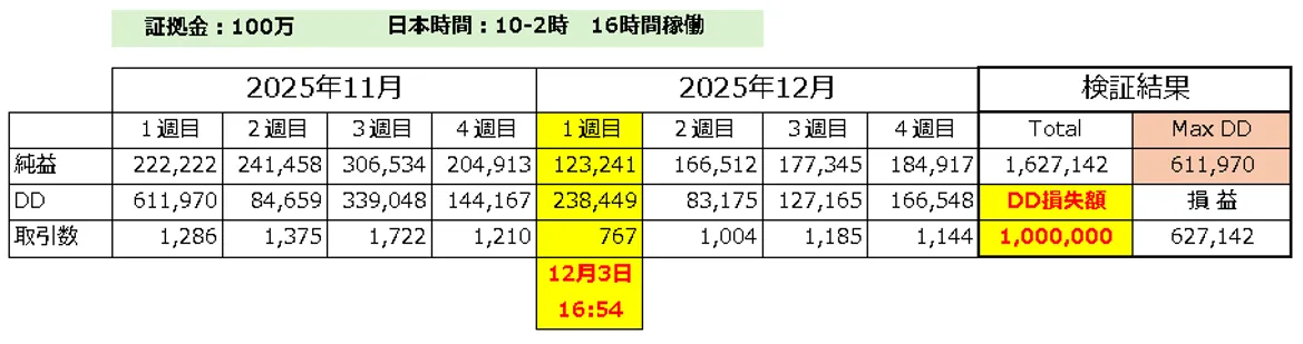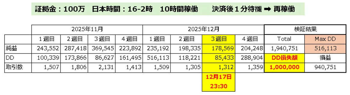 以下のバックテストは、小さなレンジを避けた設定ですが、12月3日に全損ロスカットが1回ありました。