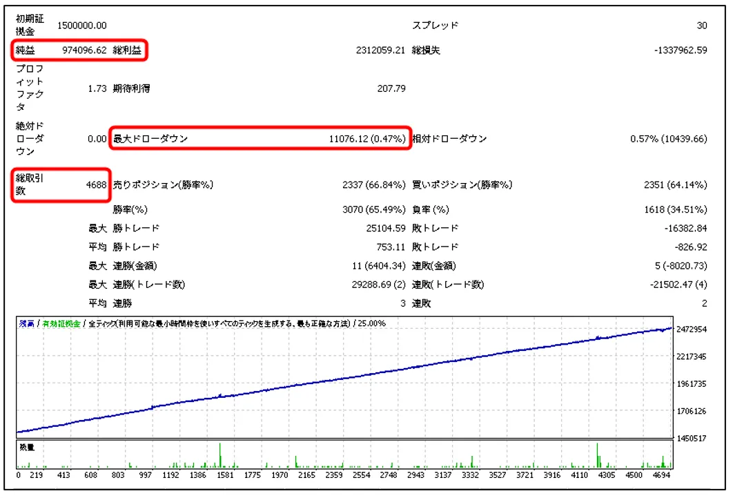 純益 974,096円 最大ドローダウン 11,076円(0.47%) 総取引数 4,688