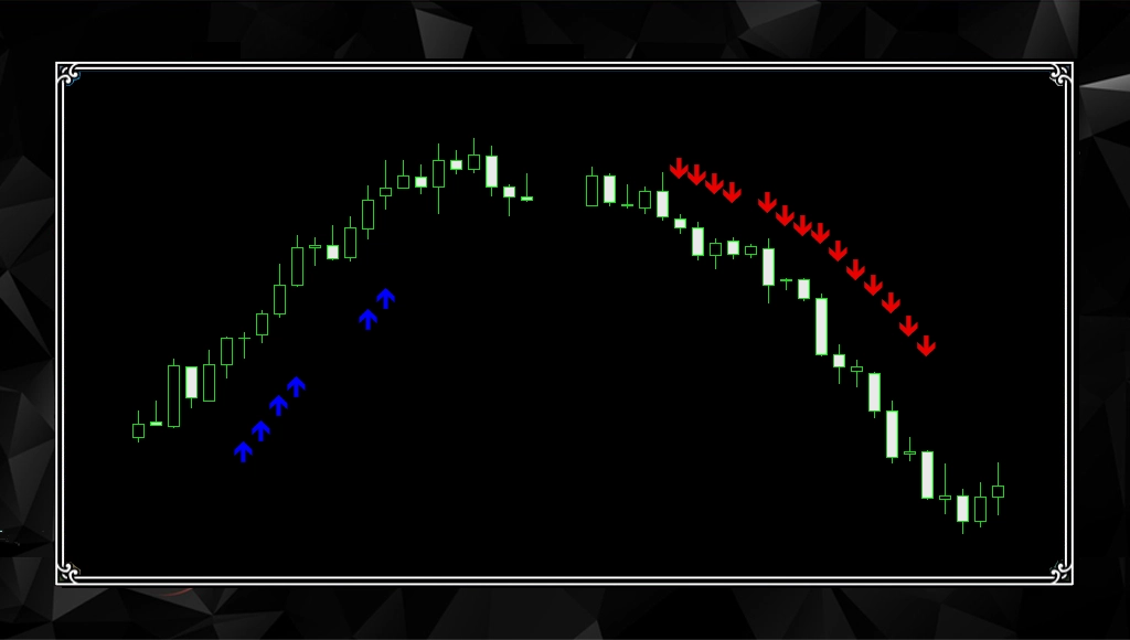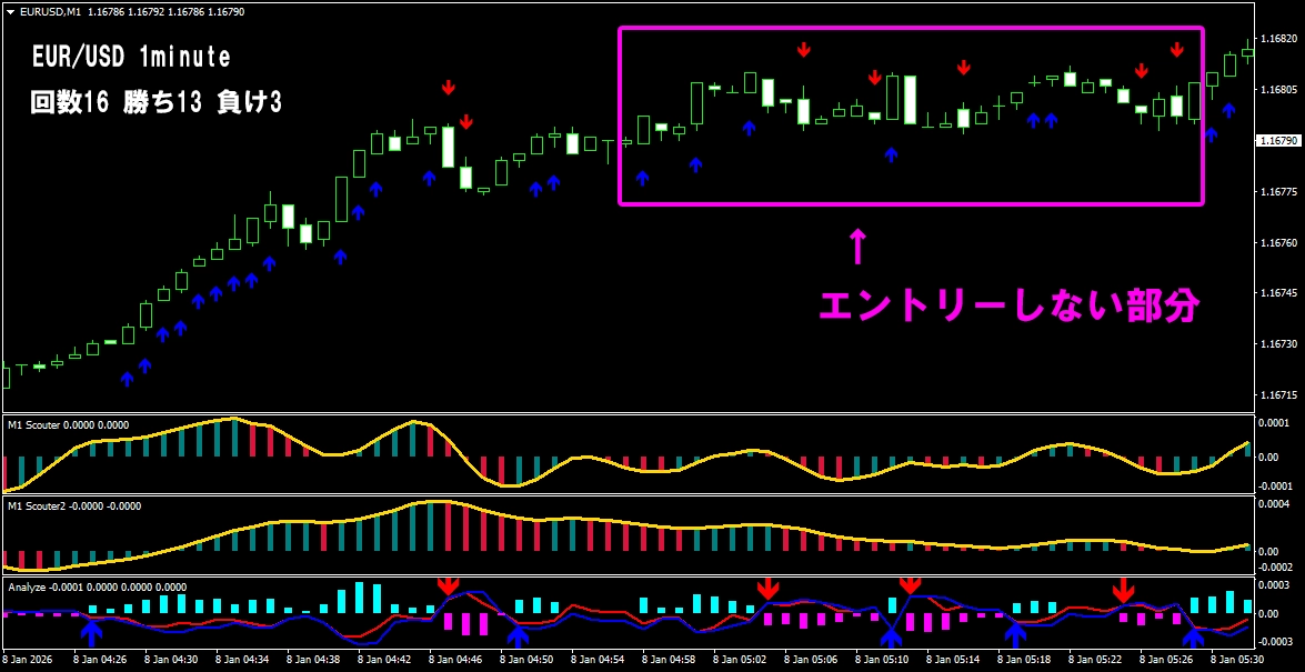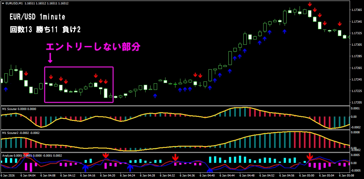 ① まず、ローソク足の動きをしっかり確認します 過去のローソク足を見て、 今が上に進んでいるのか、下に進んでいるのかを判断します。 ② 勢いよく動いている場面で、矢印が連続して表示されます 流れがはっきりしているときだけサインが出るので、 無理なエントリーをしなくて済みます。