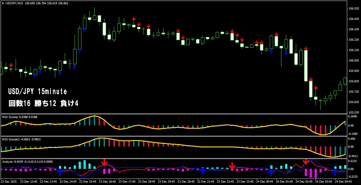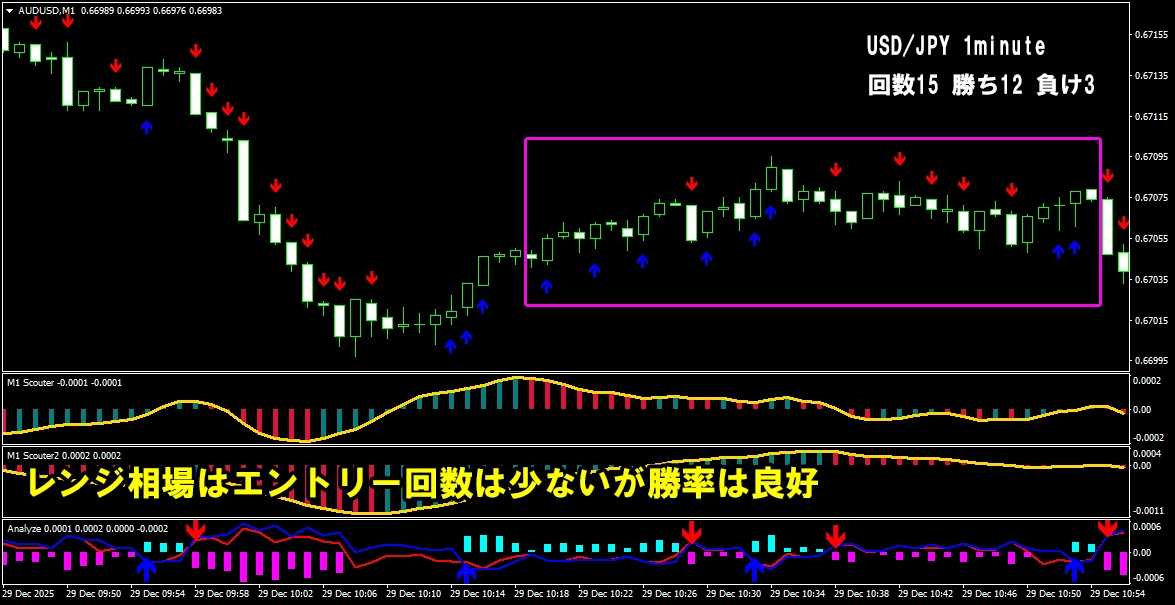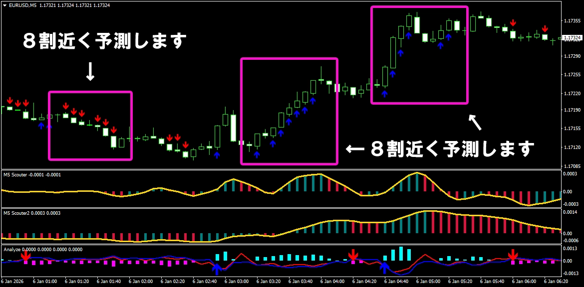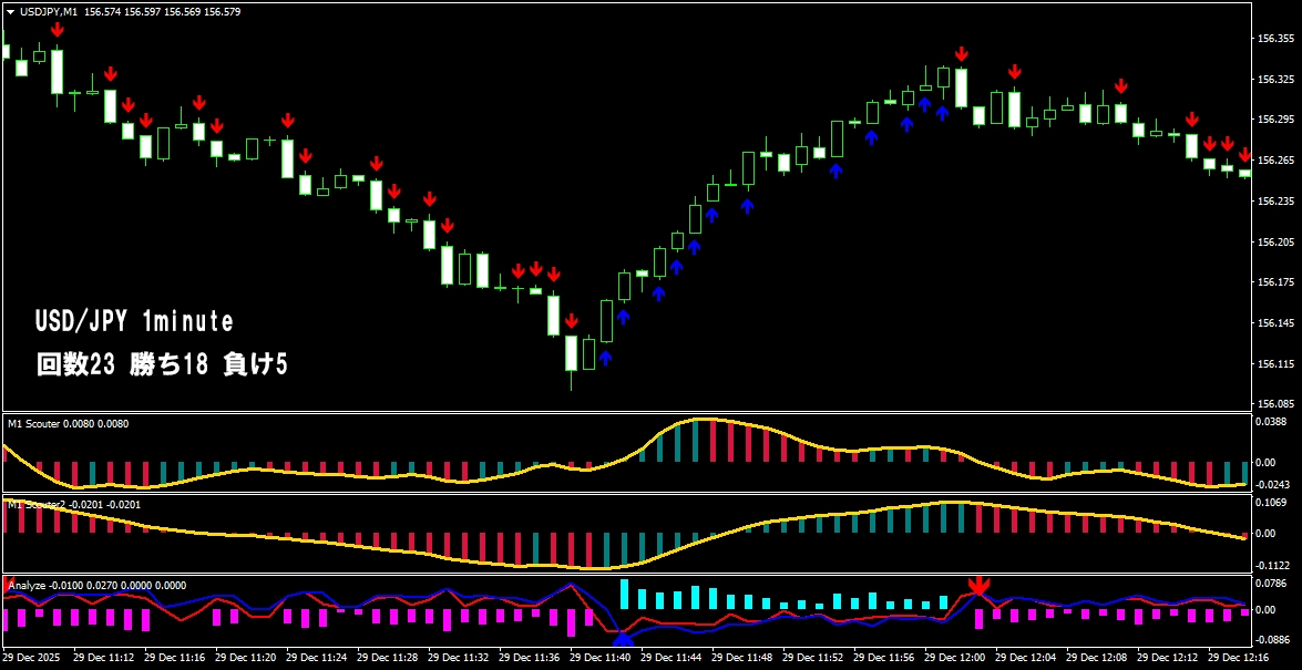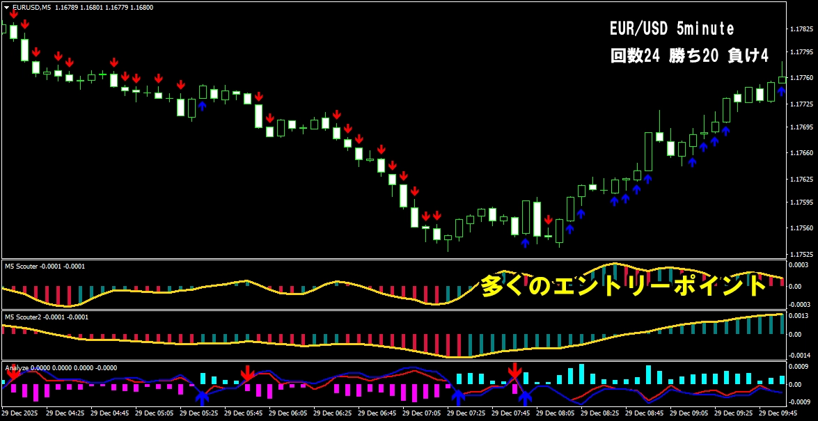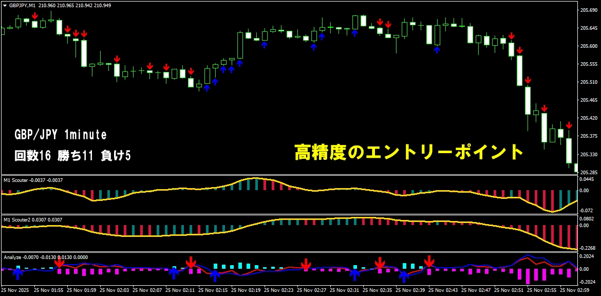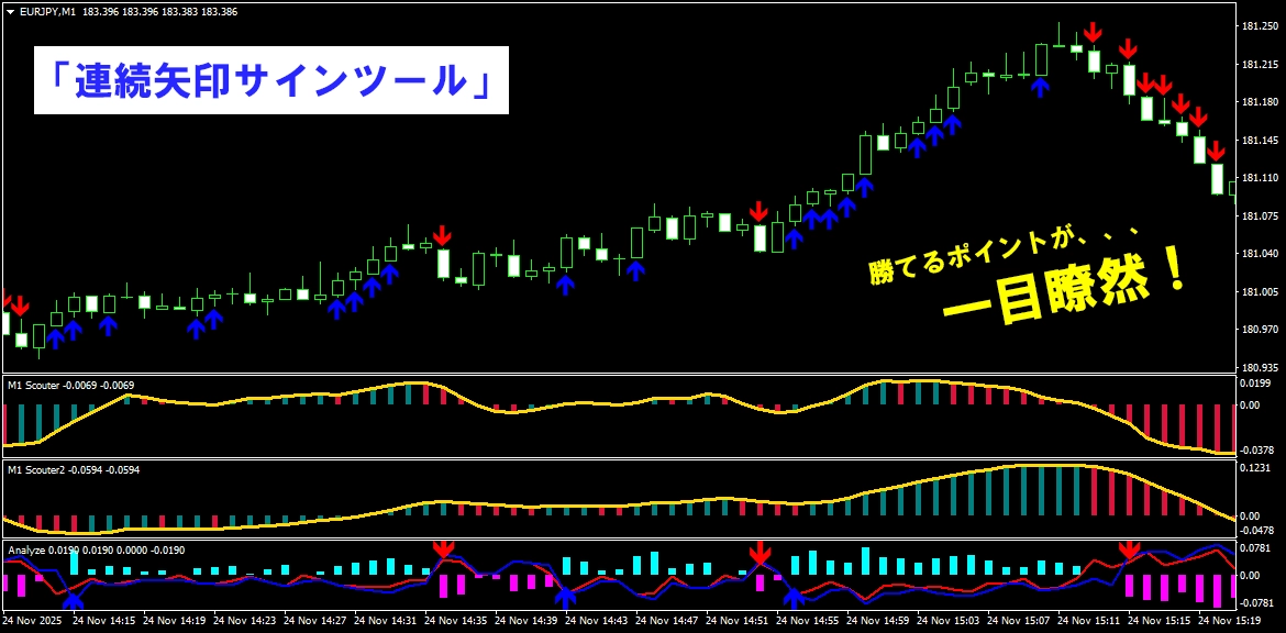 このように、 少し前のローソク足から相場の方向を分析し、 勢いが続いているポイントで矢印が連続して出る仕組みになっています。 そのため、 自分であれこれ考えたり、迷ったりする必要はほとんどありません。 サインが出たら、 その流れに合わせてトレードするだけ。 「判断に迷ってチャンスを逃す」 「エントリーが遅れてしまう」 そんな悩みを減らし、 シンプルで分かりやすいトレードを実現します。