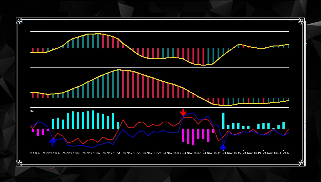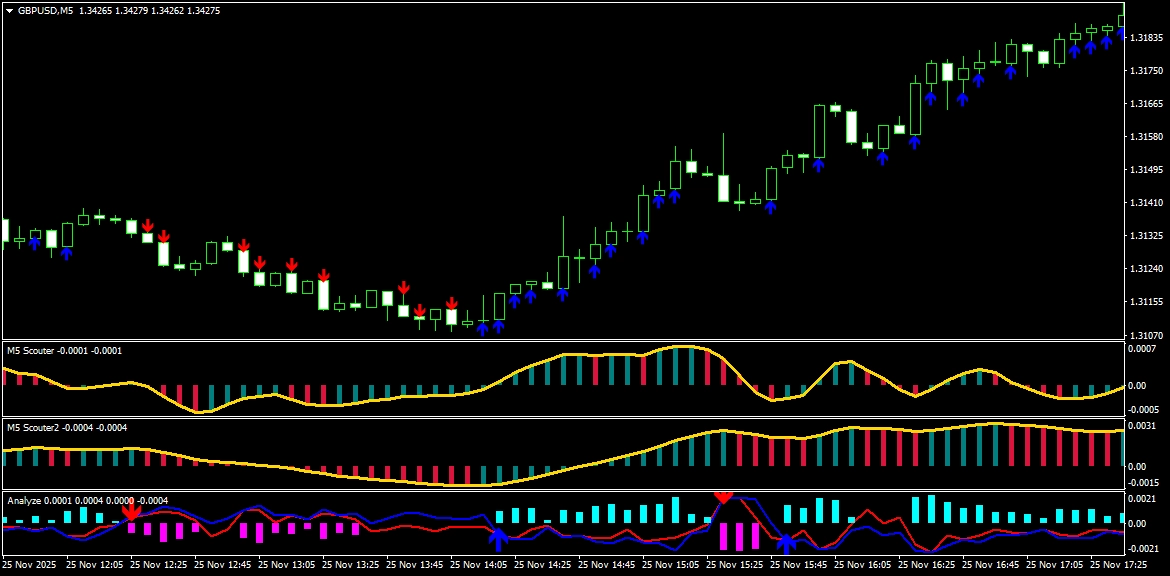 このツールには、主に次の4つの特長があります。 ① ローソク足の勢いが続いている間、矢印が連続して表示されます 相場に勢いがあるときだけサインが出るので、 無理なエントリーを減らすことができます。 ② 今まで見逃されがちだった大事なサインもしっかり表示 「気づいたらチャンスが終わっていた…」 そんな場面をできるだけ減らすよう工夫しています。 ③ トレンド相場か、横ばい相場かをサブチャートで分かりやすく分析 今の相場状況が一目で分かるので、 初心者の方でも判断しやすくなっています。 ④ 本当に勝ちやすいポイントだけでサインを表示(リペイントなし) あとからサインが消えることはありません。 安心してトレードに集中できます。