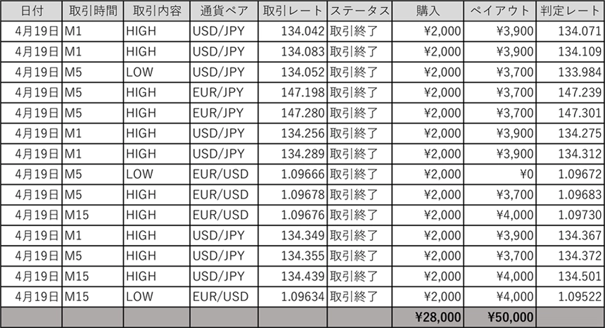 ■自己紹介 投資を始めてから、気づけば16年が経ちました。 また、トレードの考え方(ロジック)やツールの開発には、約20年ほど関わっています。 現在は、 バイナリーオプションやFXで得た資金をもとに、 別の事業にも取り組みながら活動しています。 正直なところ、 長い間、自分自身が副業として安定して使ってきた手法を公開することには、 少なからず不安やリスクもありました。 それでも、 「もう一度前向きに頑張りたい」 「少しでも生活に余裕を持ちたい」 そんな方のお役に立てて、笑顔を取り戻すきっかけになるのであれば、 そのリスクを引き受けようと決めました。 そのため、 このツールは 本気で取り組みたい方、ルールやマナーを大切にできる方に限って お使いいただきたいと考えています。 「RiZINサインツール」は、 勝率へのこだわりだけでなく、 無理のないエントリー回数にも徹底的にこだわり、 本当に多くの時間をかけて完成させました。 また、 購入後も長く安心して使っていただけるよう、 安定性を重視したロジックを採用しています。 普段は仕事もしているため、 1日にだいたい5回ほど勝てたら、その日のトレードは終了しています。 それでもこのスタイルで、 6年以上にわたり、トレードを継続してきました。 これまでの経験をもとにご提供している情報やツールですので、 同じような結果を目指しやすい、再現性のある内容になっていると思います。 最後までお読みいただき、ありがとうございます。 どうぞ、よろしくお願いいたします。 投資家:RiZIN(当社業務提携プロトレーダー)
