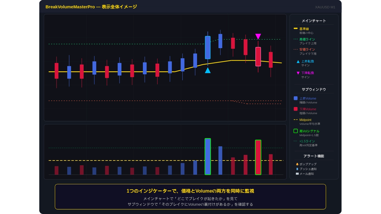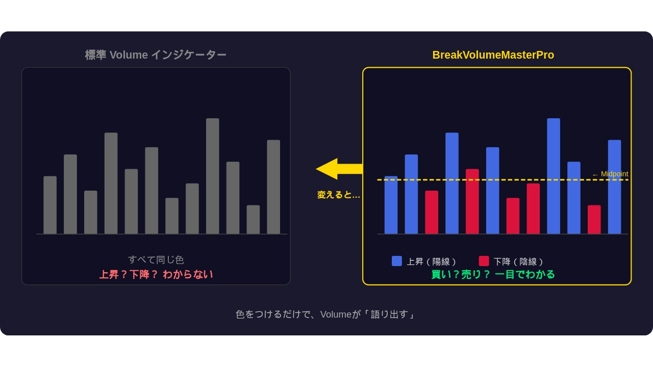 | 📊 BreakVolumeMasterPro(MT5インジケーター) | Volume色分け+ミッドポイント+ブレイクサイン統合インジケーター |