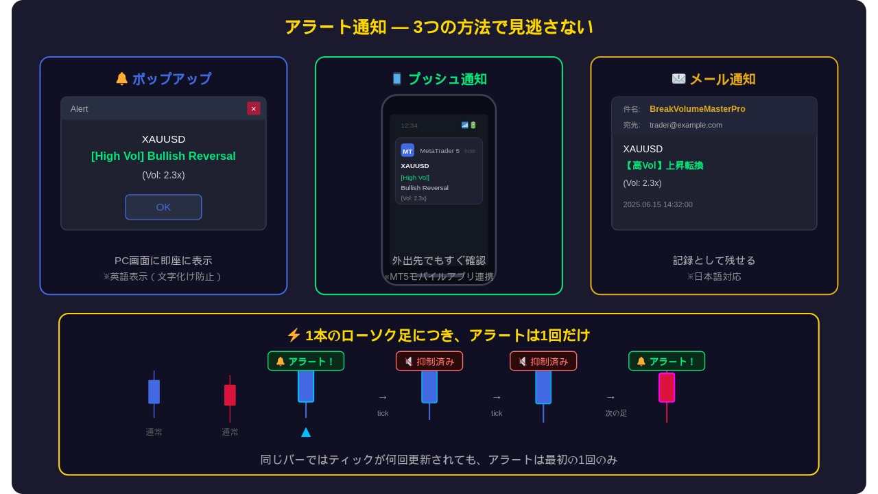 1本のローソク足につき、アラートは1回だけ。 連続で鳴り続けることはありません。 高ボリューム時のみアラートを出す設定も可能です。