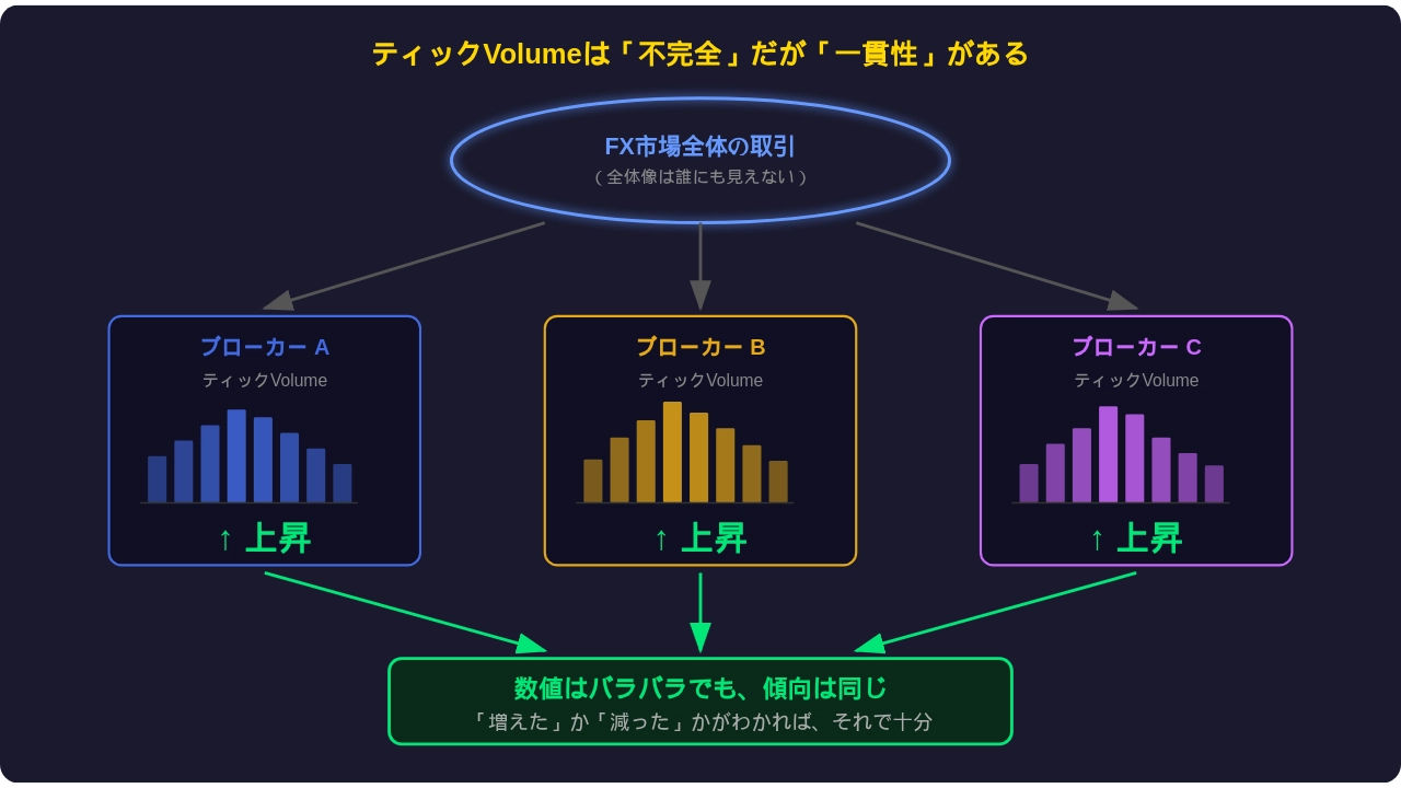 「株と違って、全取引量が見えるわけじゃない」 「ブローカーごとにバラバラで一貫性がない」 「ティックVolumeなんて、所詮は不完全なデータでしょ」
