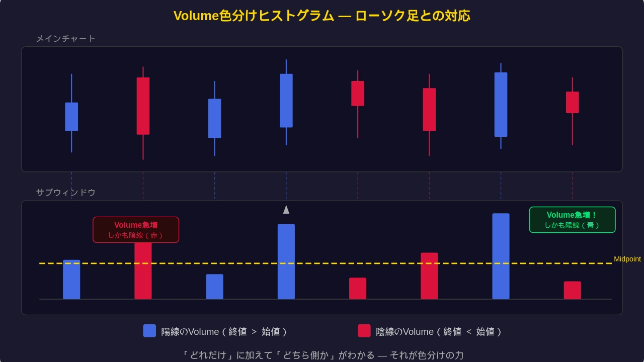 たったこれだけのことですが、標準のVolumeインジケーターにはこの色分けがありません。