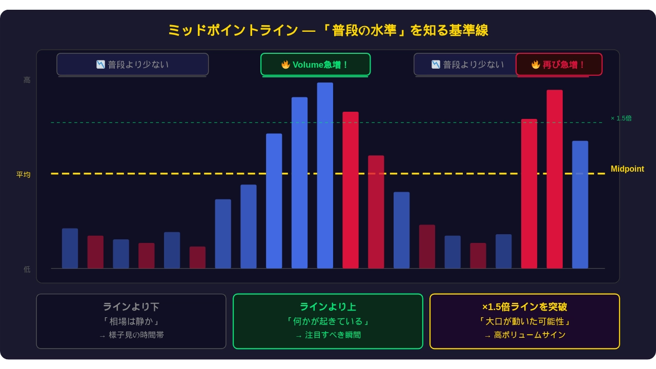 これは直近のVolumeの平均水準を示すミッドポイントラインです。