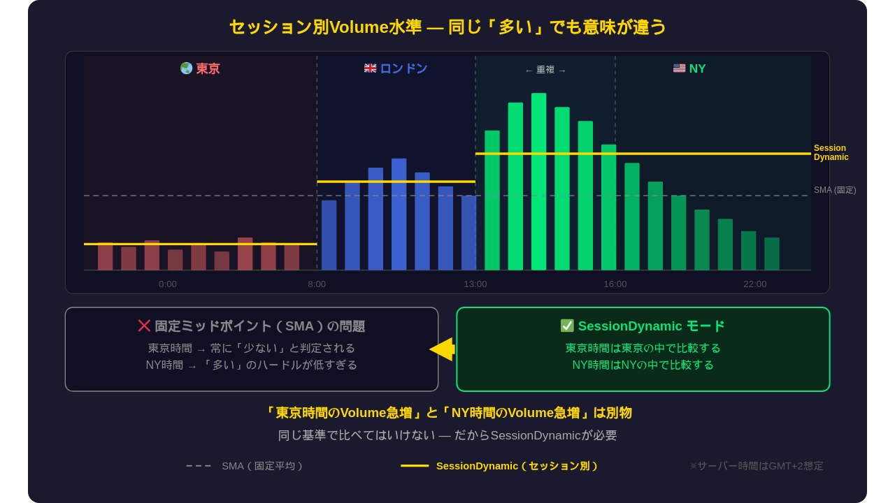 東京時間、ロンドン時間、NY時間——時間帯によってVolumeの水準はまったく違います。