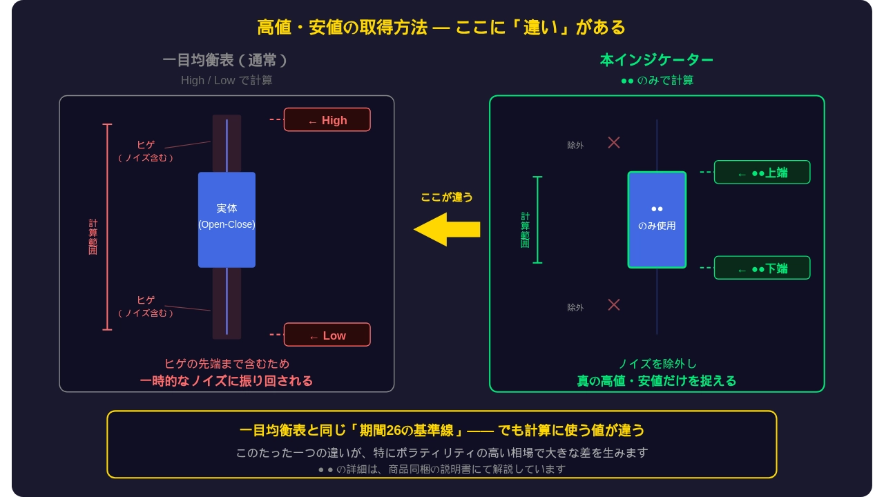 ●●をベースにした独自の計算で、ノイズに振り回されにくい高値・安値を算出しています。
