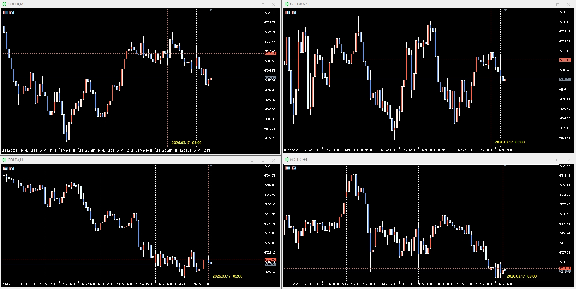 ・キーをもう1回押すと全チャートが同じ時刻にジャンプ — スクロール操作なしで全チャートのビューが一瞬で揃う