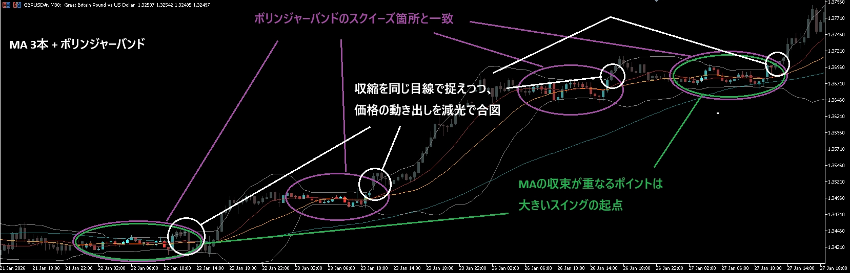 ・価格の収縮(レンジ)を捉える。