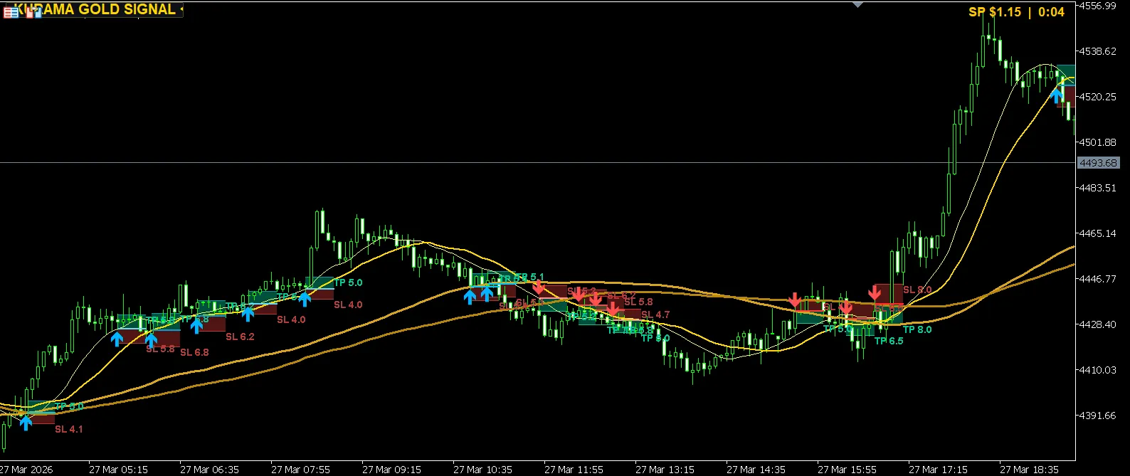 KURAMA GOLD SIGNALは、過去のシグナルの矢印・TP/SLゾーンがすべてチャート上に残ります。緑のTPゾーンに価格が届いていれば利確成功、赤のSLゾーンに届いていれば損切り。一目でどのシグナルが勝ち、どのシグナルが負けたかがわかります。