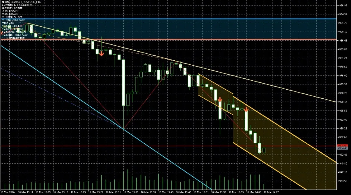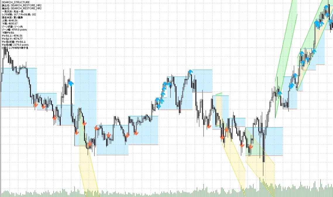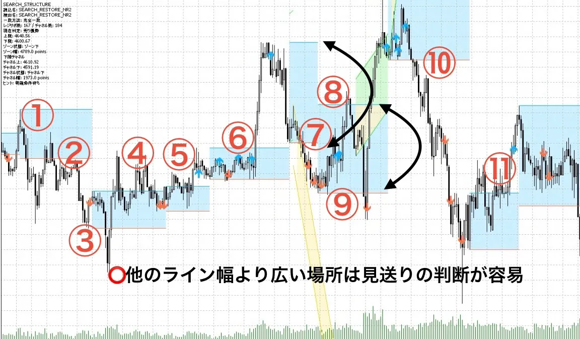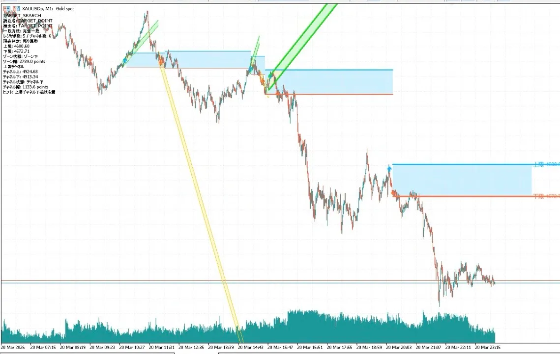 チャネルや平行線などの補助機能も搭載していますが、確定足ベースで描画されるため、リアルタイム判断では遅れが生じます。