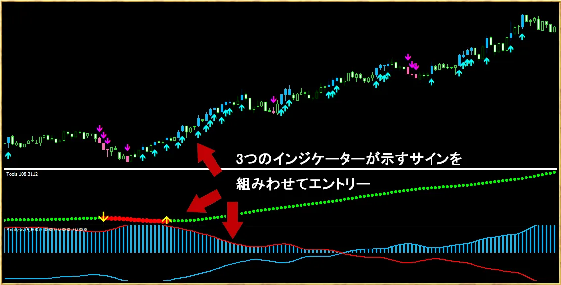 3つのインジケーターが示すサインを組みわせてエントリーします。