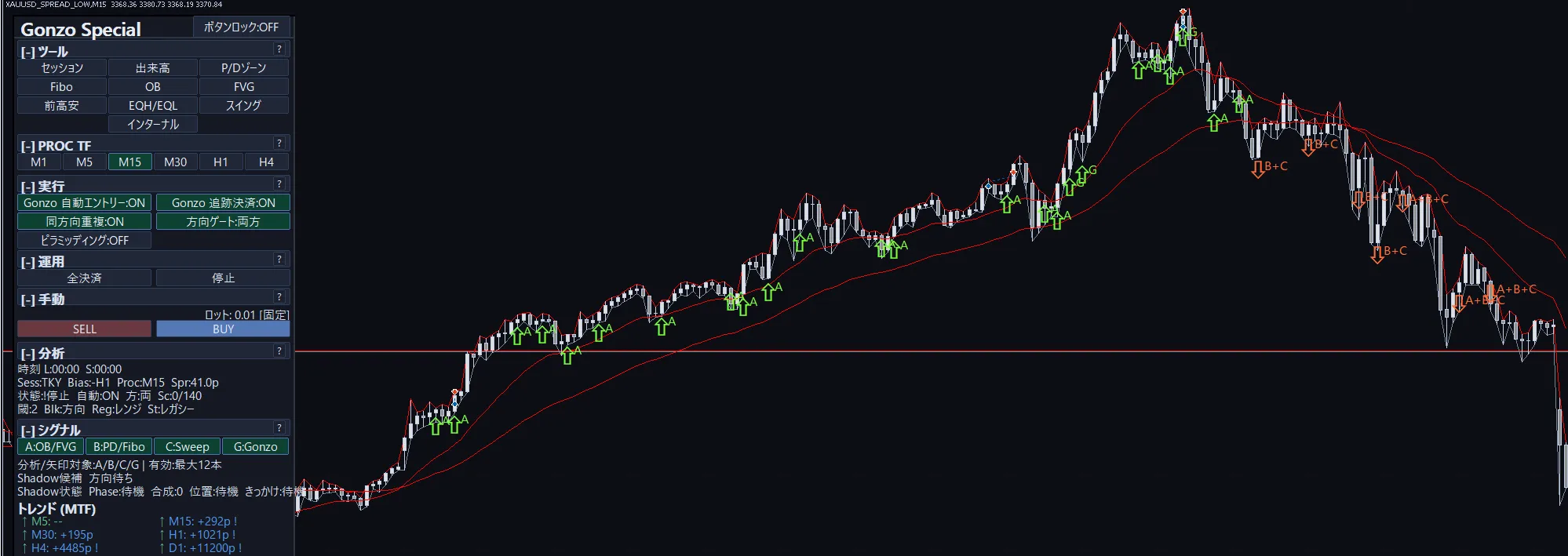 Gonzo Special は、XAUUSD(ゴールド)向けに設計された、フルオートと半裁量の良さを一つにまとめたハイブリッド運用EAです。