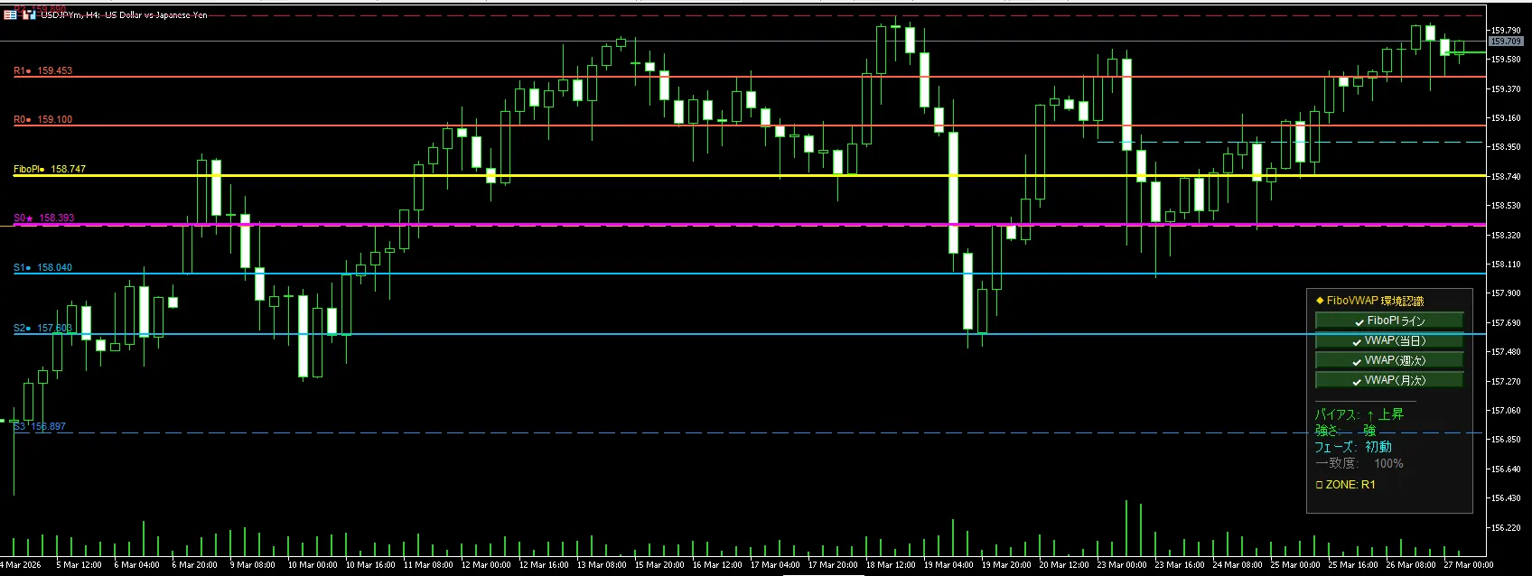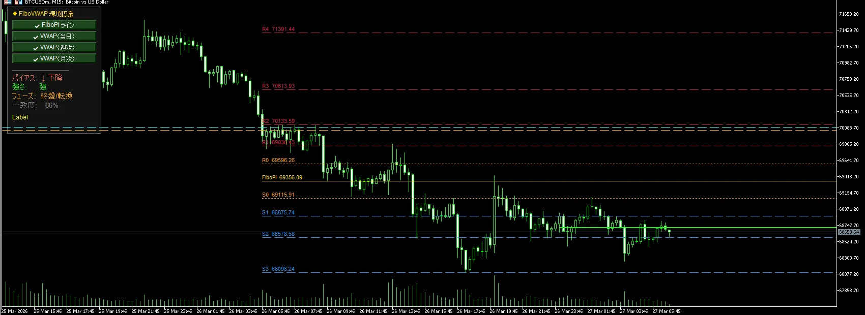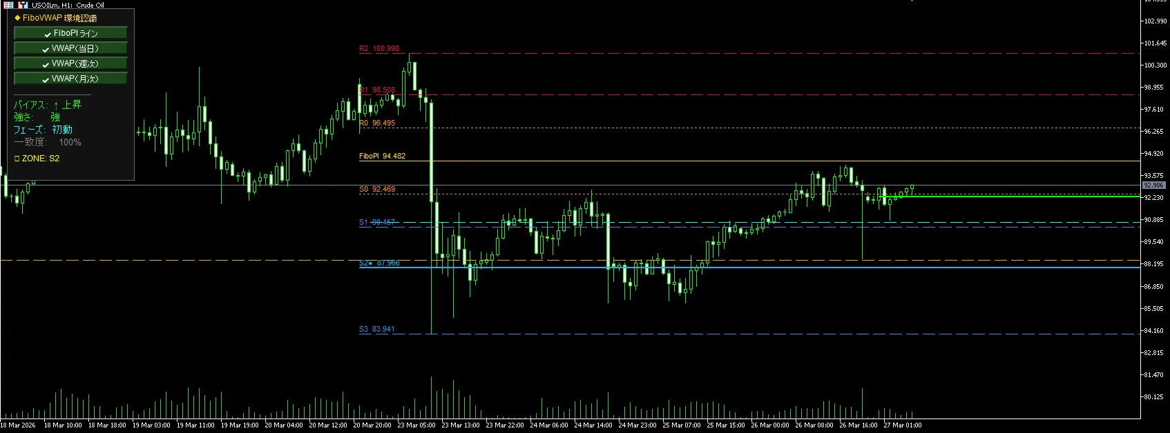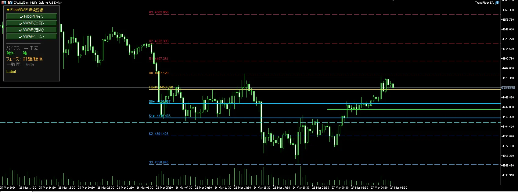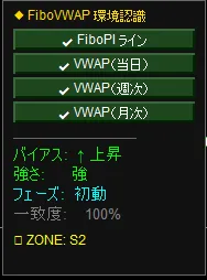 ■ 特徴② トレンドの方向・強さ・フェーズが一目でわかる 当日・週次・月次の3種類のVWAPを同時に表示し、 現在価格との位置関係から環境認識を自動判定します。 画面上のパネルには常に以下が表示されます