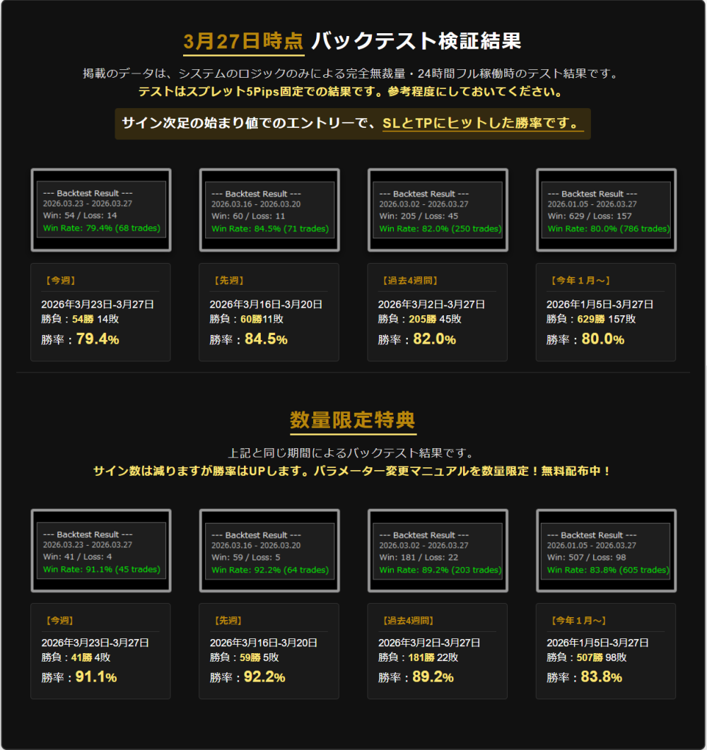 本システムは、過去のデータに基づき高い優位性を示すように設計されておりますが、将来の利益を100%保証するものではありません。相場の急変(フラッシュクラッシュ、要人発言等)により、想定以上の損失を被るリスクが存在します。本システムを利用したことによるいかなる損失・損害についても、開発者および販売元は一切の責任を負いかねます。投資はすべて自己責任にてお願いいたします。